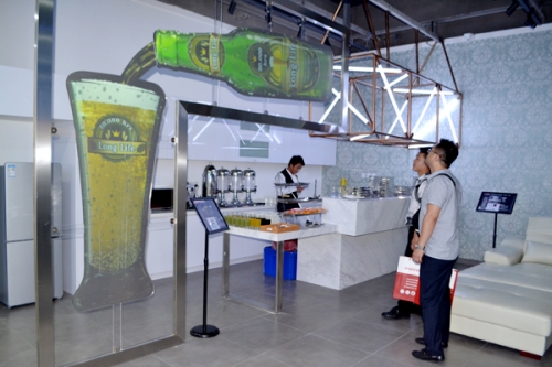 日立創新影像空間充分利用開闊空間,創造了面向商業、教室、家居等各種應用的精彩方案:迎接賓客的階梯投射與前臺墻面投影令人倍感親切,適合商業應用的8K巨幕廣告墻、酒瓶異形廣告牌方案引人矚目;面向美術館、音樂廳的變換燈、激光投影與鋼琴Mapping方案則極具創意;適合商業樣板間和家具商場的軌道鏡Mapping意趣盎然;模擬高爾夫球方案則是成熟的商業應用。觀景窗、地面廣告、豎投廣告等方案是創意與商業的精彩結合;數字餐廳實現視覺與味覺的巧妙融合;智能投影壁燈適合打造創意方案等備受與會嘉賓的關注。