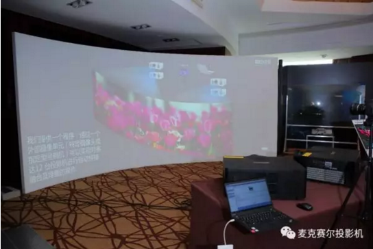 現(xiàn)場展示的是一張2.5m高*5.6m寬的弧形屏幕,用兩臺7000流明的激光投影機進行拼接投影,通過專用軟件同時處理拼接融合和曲面校正。從搭建好硬件設(shè)備到調(diào)試完畢,總共只用了10分鐘,超越了以往傳統(tǒng)的調(diào)試方法,大大解放了勞動力更節(jié)約了時間和成本!