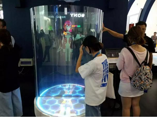 此展區(qū)以模擬仿真投影為靈感,在透明柱形空間中對(duì)半透明玻璃進(jìn)行投影,從而獲得影像懸浮于空中的全息般視覺效果。其中,投影屏幕采用了麥克賽爾研發(fā)的業(yè)內(nèi)領(lǐng)先的具備隔熱阻熱功能的半透明屏幕膜,實(shí)用性和美觀度兼具。二次元人物的可愛造型和虛幻漂浮的效果,讓展項(xiàng)前的觀眾不時(shí)舉起手機(jī)拍攝。
